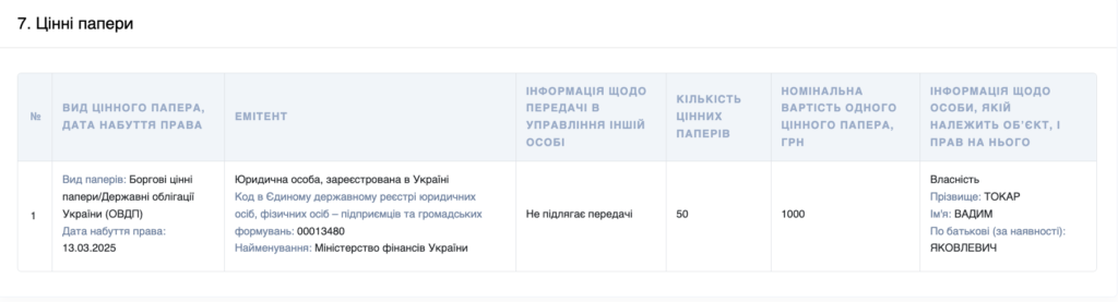 Також посадовець задекларував державні облігації України (ОВДП), емітентом яких є Міністерство фінансів України. У власності селищного голови перебуває 50 облігацій номінальною вартістю 1 000 грн кожна.