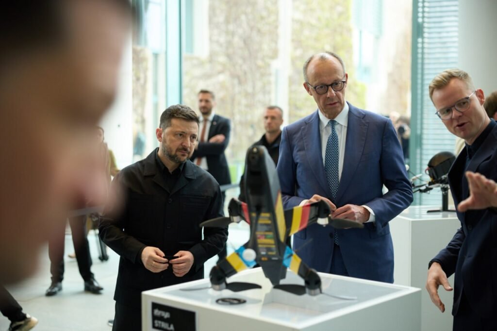 В Офісі президента повідомили, що перед зустріччю Володимира Зеленського та Фрідріха Мерца було продемонстровано сім видів дронів, виготовлених на українських підприємствах, передає Хронікерс.