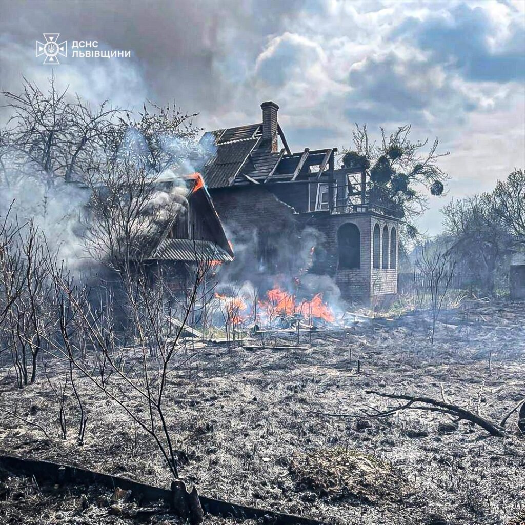 «До місця події оперативно прибули пожежні підрозділи з міст Соснівка та Шептицький. На момент їхнього прибуття суха трава горіла окремими осередками на площі близько 200 кв. м, полум’я розповсюдилось на чотири дачні будинки», — кажуть у ДСНС.