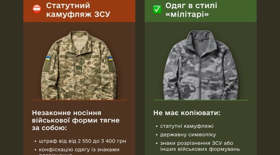 Заборонено використовувати статутні камуфляжі з шевронами та знаками розрізнення ЗСУ чи інших військових.