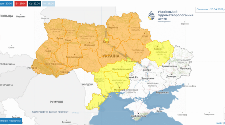 21-22 квітня в північних областях, 22 квітня і у західних та більшості центральних — в повітрі заморозки 0-3°. Встановлено другий рівень небезпеки, “помаранчевий”.