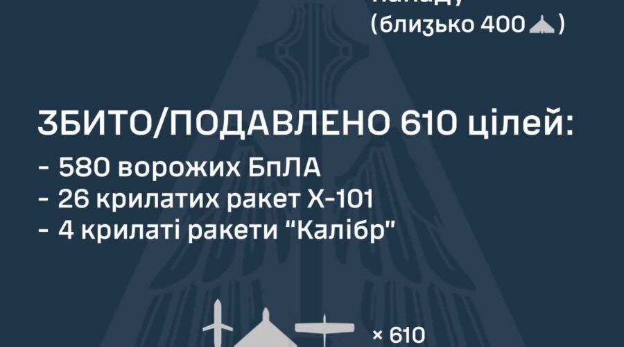 За попередніми даними, станом на 08:00, протиповітряною обороною збито/подавлено 610 цілей – 30 ракет та 580 безпілотників різних типів: