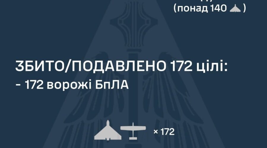 За попередніми даними, станом на 08:00, протиповітряною обороною збито/подавлено 172 ворожих БпЛА на півночі, півдні, заході та сході країни.