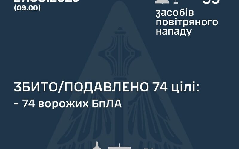 “За попередніми даними, станом на 09.00, протиповітряною обороною збито/подавлено 74 ворожих БпЛА типу Shahed і дронів-імітаторів різних типів на півночі, півдні та сході країни”, – йдеться у повідомленні.